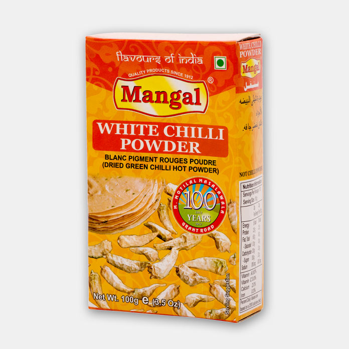 Whilte Chilli Powder: Very hot powder of dried green chillies, used for snacks,papads and to make chinese & thai extra hot.