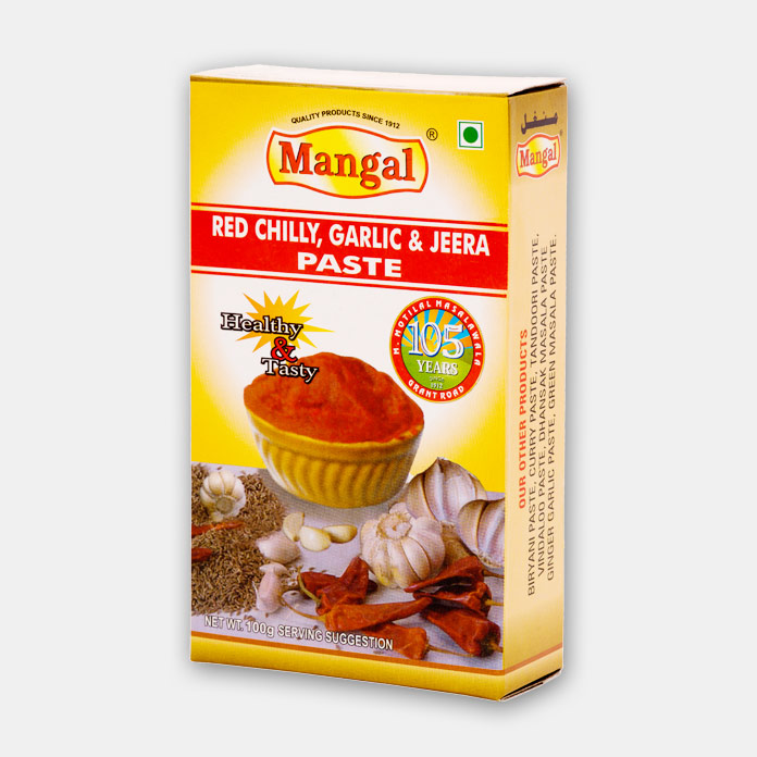 Mangal Red Chilli- Garlic -Jeera Paste is useful for Veg. Non- Veg.dishes. Taste enchancer- use as chutney for snacks. Use for Sandwiches, Pav Bhaji, bhel, Sevpuri & marinate Chicken & Meat & Chinese Dishes.